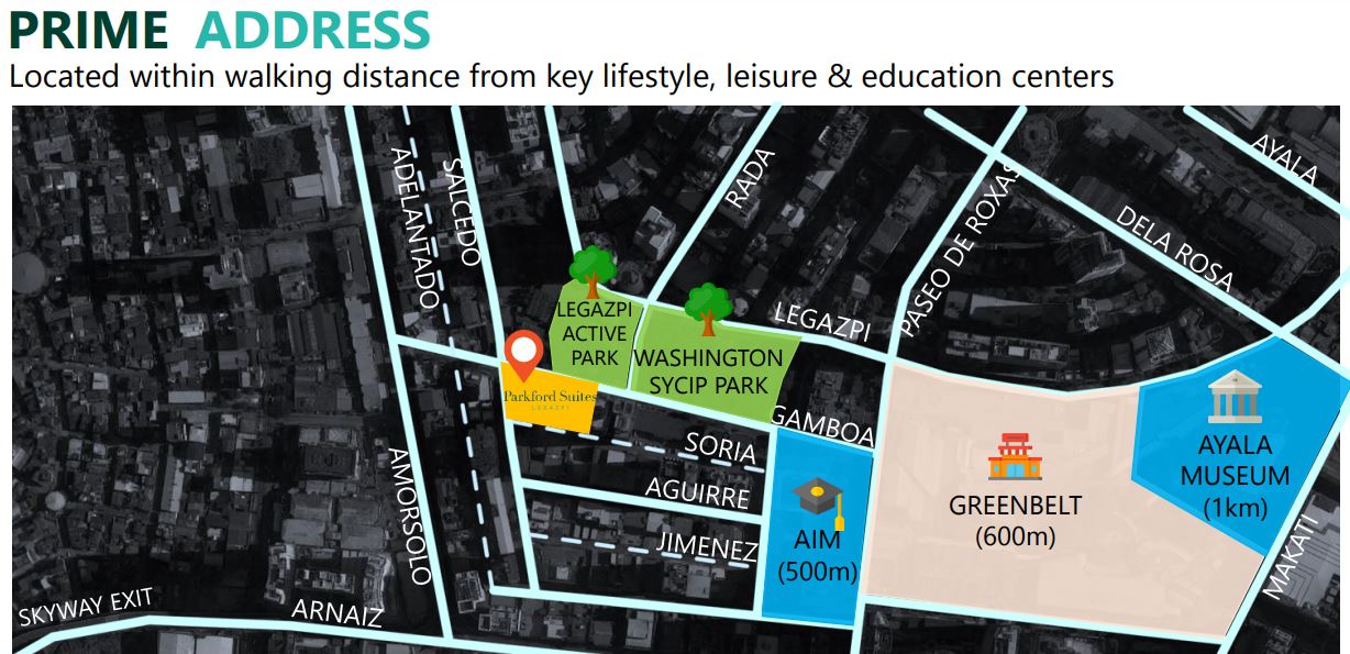 A connected haven in the heart of Makati. Parkford Suites Legazpi enjoys a highly connected location, placing you within walking distance of the Makati CBD, Ayala Center, cultural hubs, educational institutions, and leisure destinations. Embrace the serenity of green urban environments like Washington SyCip Park and Legazpi Active Park, all right at your doorstep. Easy access to major road networks ensures seamless travel within Makati and the metro.